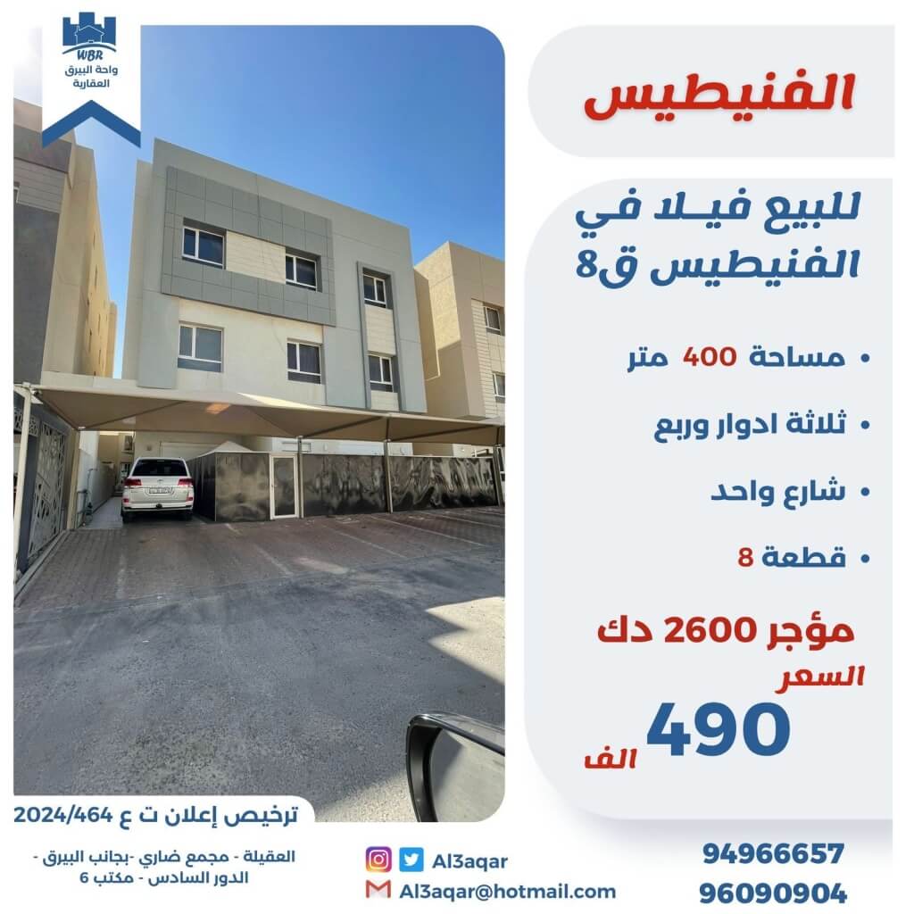 للبيع فيلا في الفنيطيس ثلاث ادوار وربع مساحه 400م شارع واحد وثيقه حره نظام ادوار مفصوله مؤجره ٢٦٠٠ دينار السعر 490 الف
