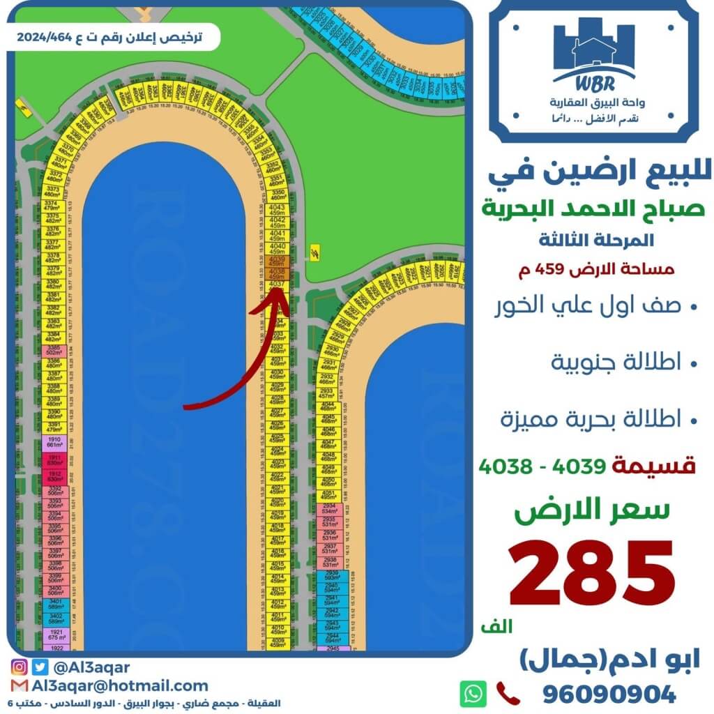 للبيع ارض في صباح الاحمد البحريه المرحله الثالثه صف اول علي الخور اطلاله جنوبيه مساحه الارض 459 متر قسيمه 4039 - 4038 سعر الارض 285 الف