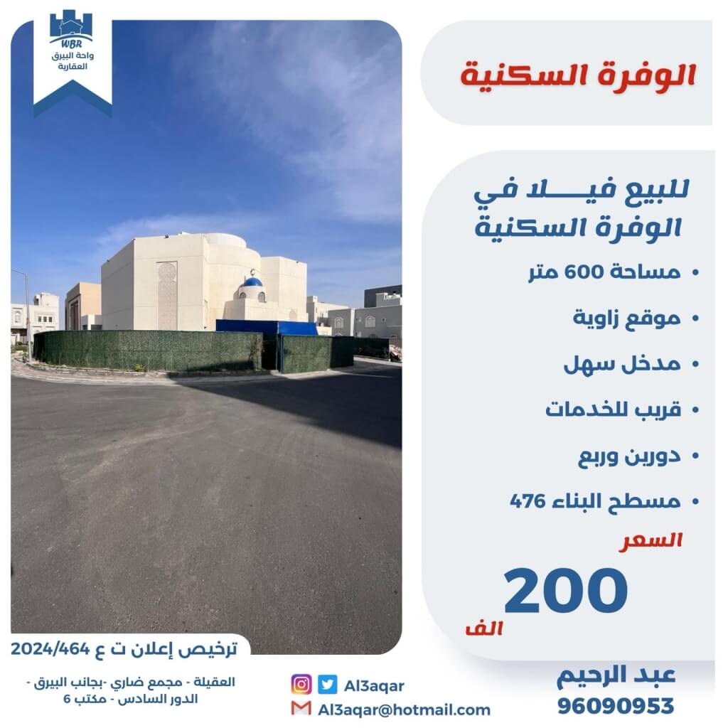 ❇️ للبيع فيلا في الوفره موقع زاويه مساحه 600 متر مدخل سهل قريب للخدمات دورين وربع مسطح البناء 476 ♦️ السعر 200 الف