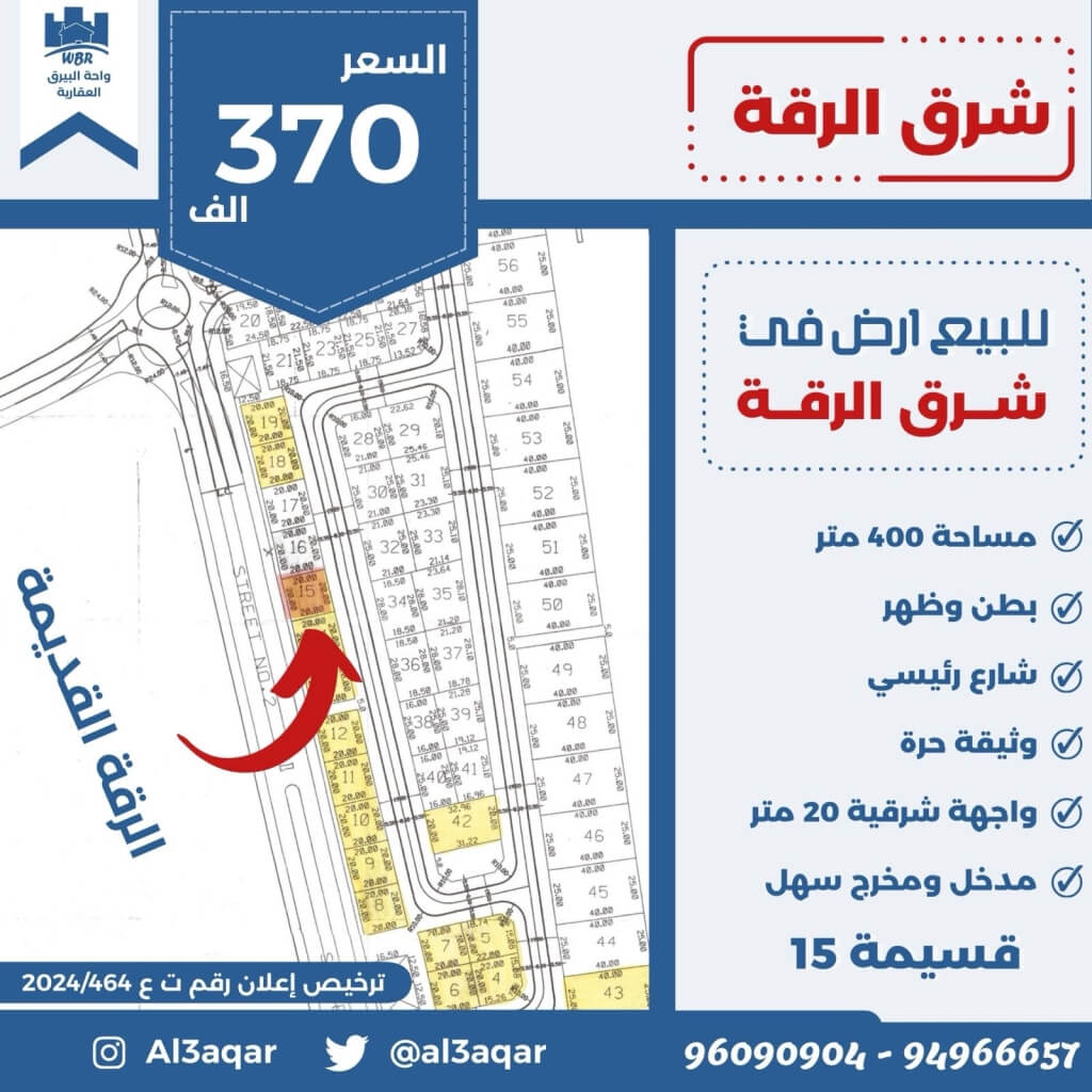 للبيع ارض في شرق الرقه بطن وظهر شارع رئيسي مساحه 400 م واجهه شرقيه مدخل سهل السعر 370 الف