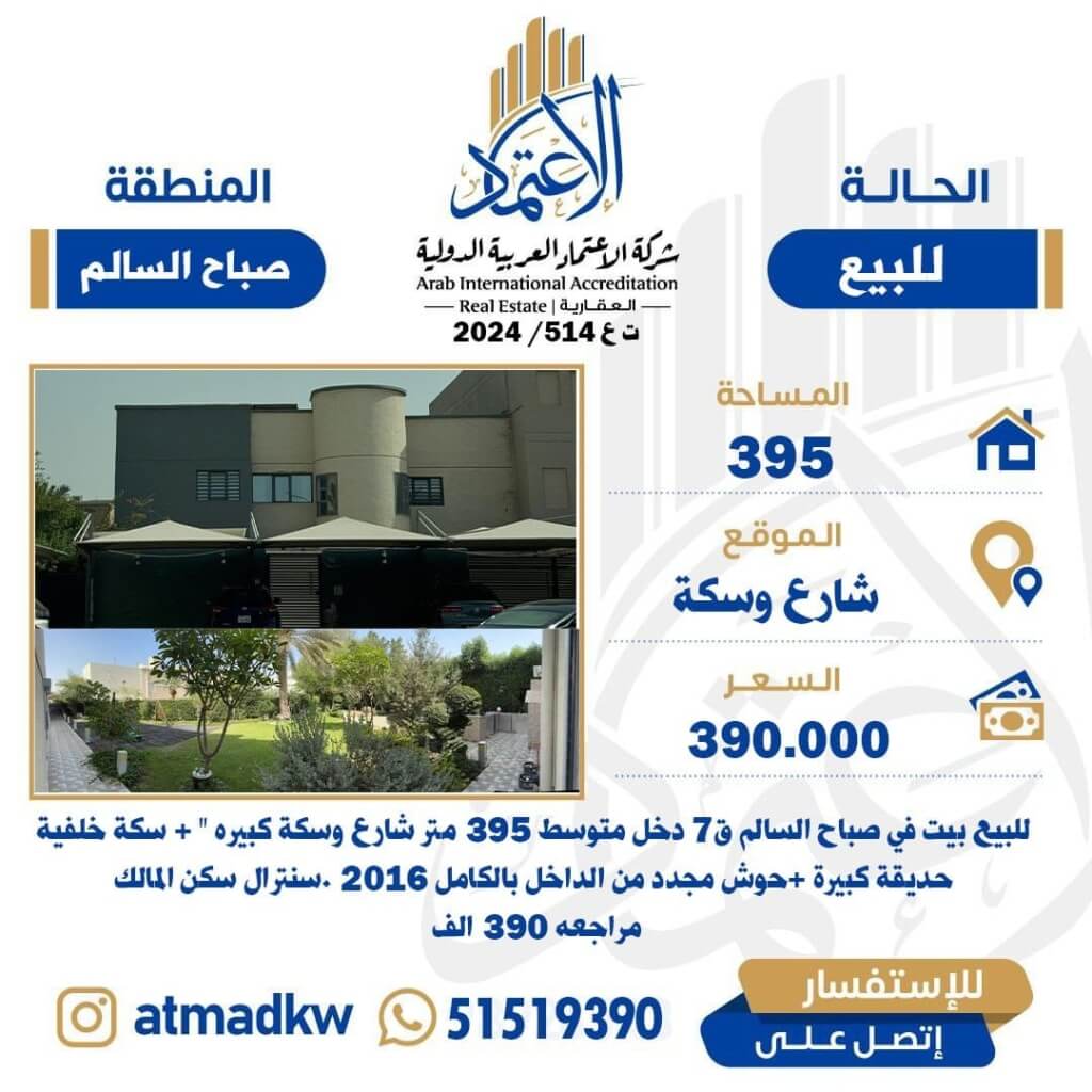 للبيع بيت في صباح السالم ق7 دخل متوسط ٣٩٥ متر شارع وسكة كبيره \" + سكة خلفية حديقة كبيرة حوش مجدد من الداخل بالكامل ٢٠١٦ .سنترال سكن المالك مراجعه 390 الف