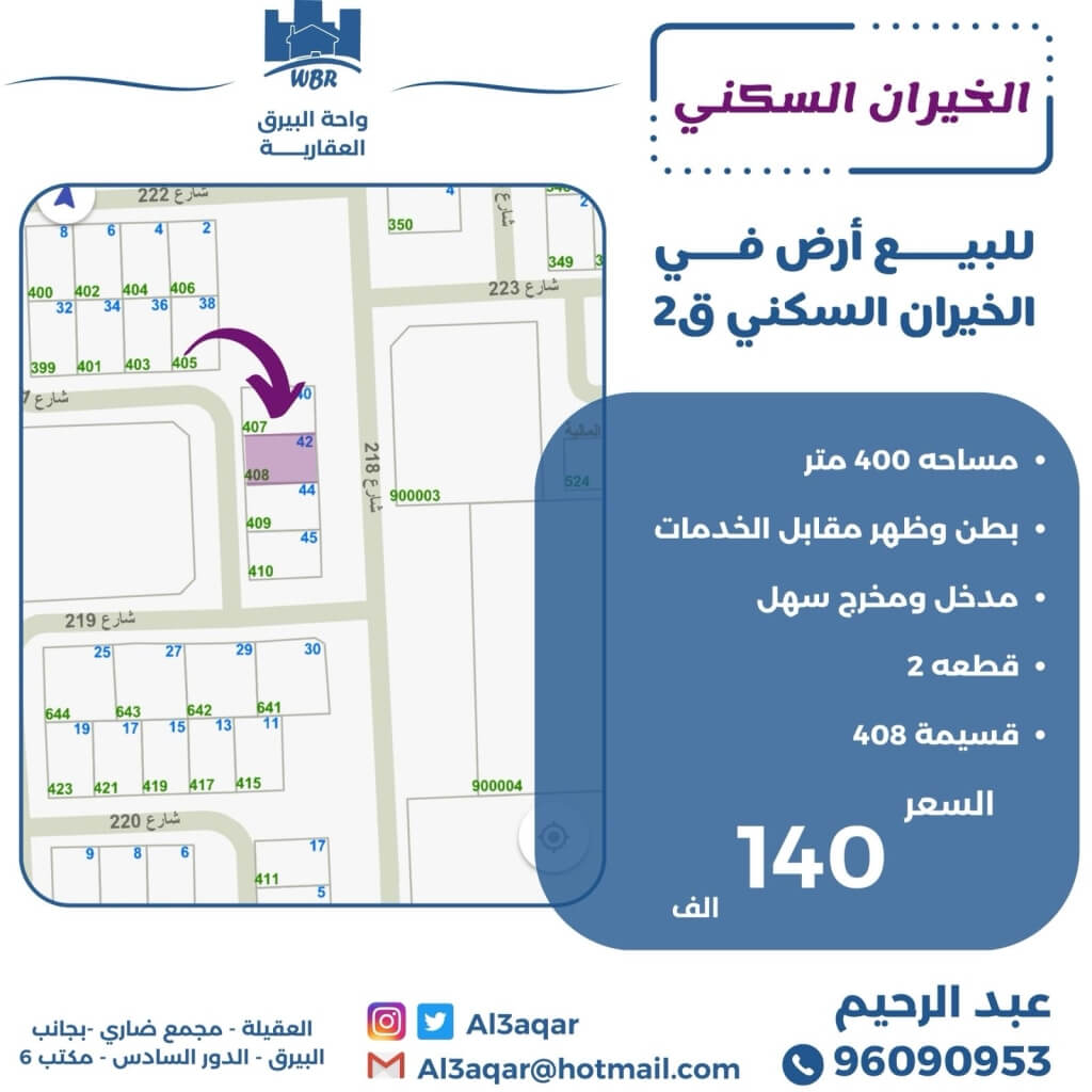 للبيع ارض بالخيران السكنية ق 2 بطن وظهر ارتداد ومقابل ساحات وخدمات من الجهتين مدخل ومخرج سهل جدا من طريق الملك مساحه 400 م٢ *السعر 140 الف*