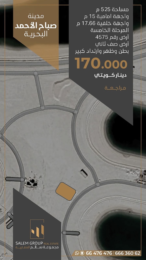 للبيع أرض صف ثاني بطن وظهر ارتداد كبير جدا في مدينة صباح الأحمد البحرية . المرحلة الخامسة رقم ٤٥٧٥ . المساحه ٥٢٥ متر واجهة الامامية ١٥ متر واجهة البرية ١٧.٦٦ متر . السعر ١٨٥ الف دك مراجعة