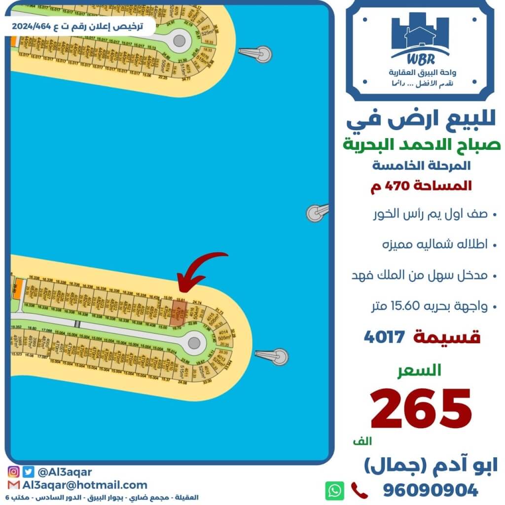 ❇️للبيع ارض في صباح الاحمد البحريه المرحله الخامسه صف اول يم راس الخور اطلاله شماليه مميزه مدخل سهل من الملك فهد مساحه 470 متر واجها بحريه 15.61 متر *السعر 265 الف*