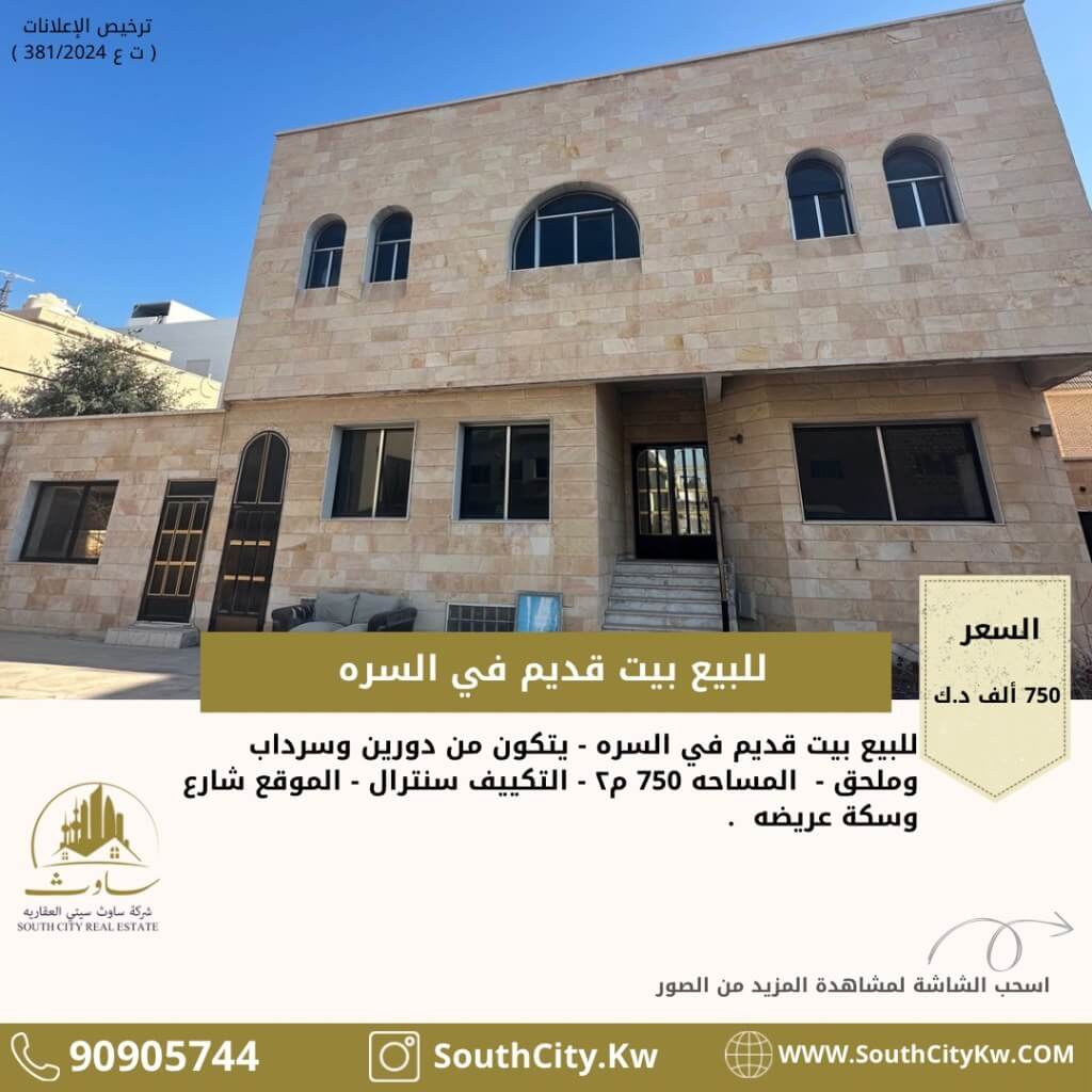 للبيع بيت قديم في ( السره ) - الموقع : شارع وسكة جانبيه عريضه - المساحه : 750 م2 - يتكون من : دورين وسرداب وملحق - واجهة البيت : 25 م