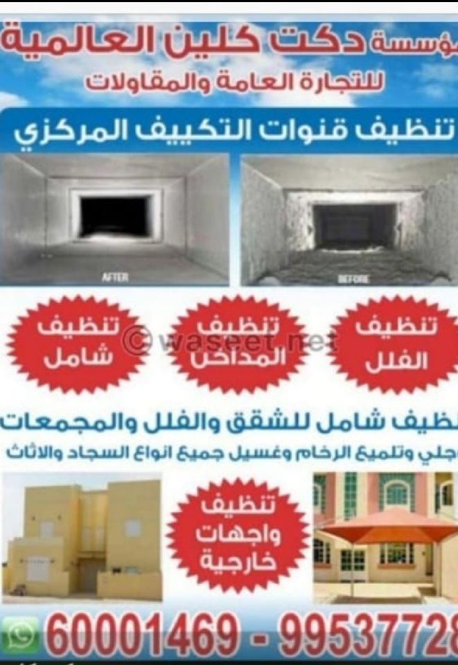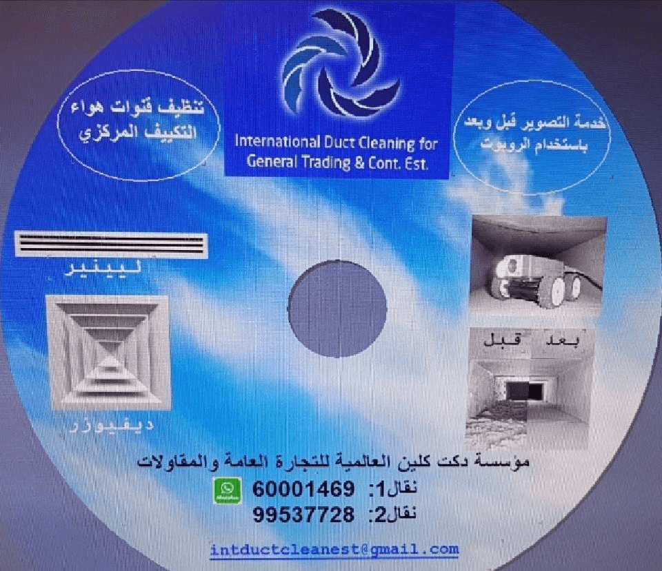 متخصصين في تنظيف قنوات التكييف المركزي للفلل والشقق والمجمعات وكل منشأة تحوي تكييف مركزي مع التصوير قبل وبعد التنظيف على سي دي الحل الامثل لمرضى الربو والحساسية وقسم خاص لصيانة واعطال التكييف المركزي والوحدات المنفصلة خدمة استقبال طلبات ٢٤ ساعة متوفر عمالة رجالية فقط للإستفسار ٩٩٥٣٧٧٢٨