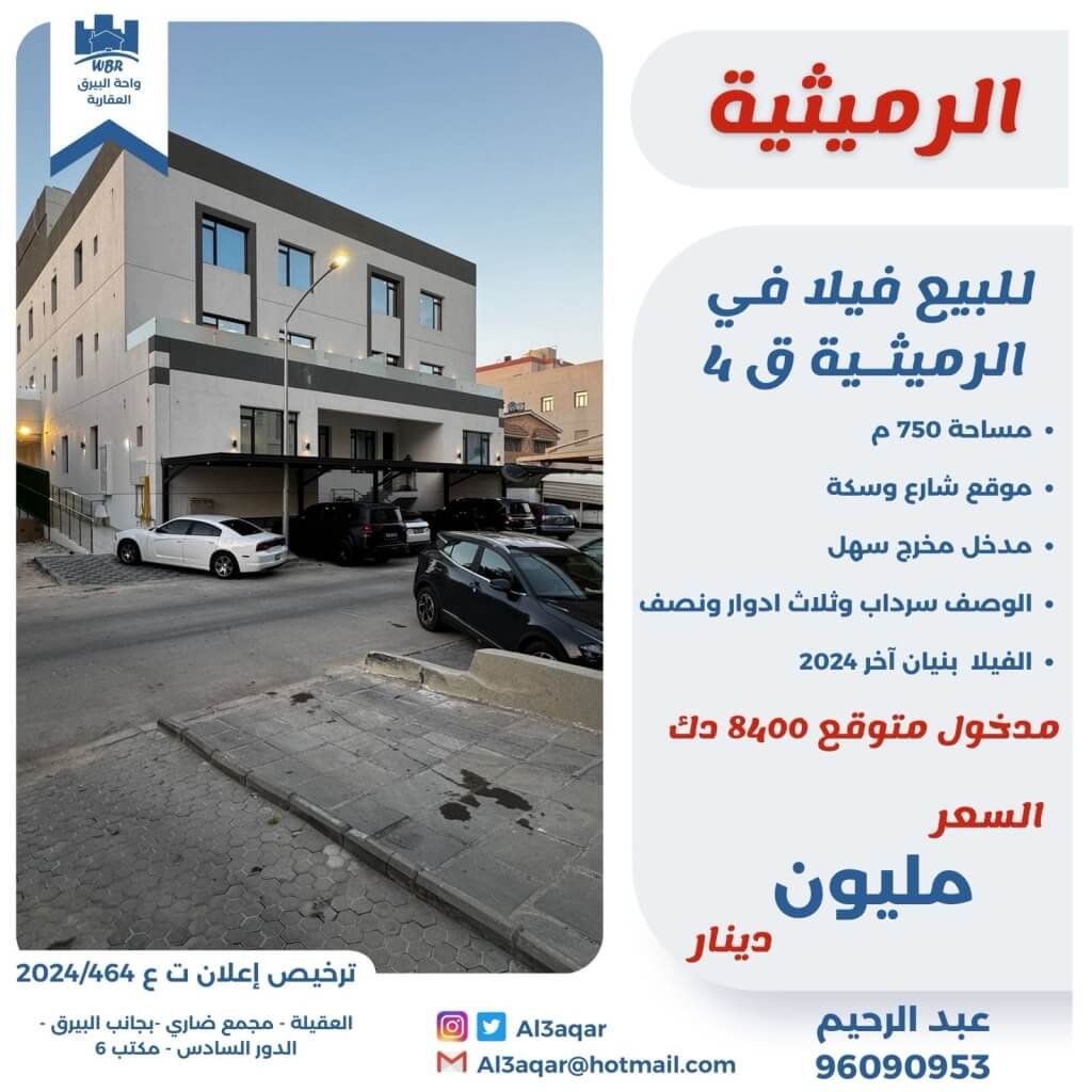 للبيع فيلا في الرميثية ق4 المساحة 750 م الموقع شارع وسكة مدخل مخرج سهل الوصف سرداب وثلاث ادوار ونصف 13 شقة الفيلا جديده بنيان آخر 2024 المدخول المتوقع 8400 السعر مراجعه مليون