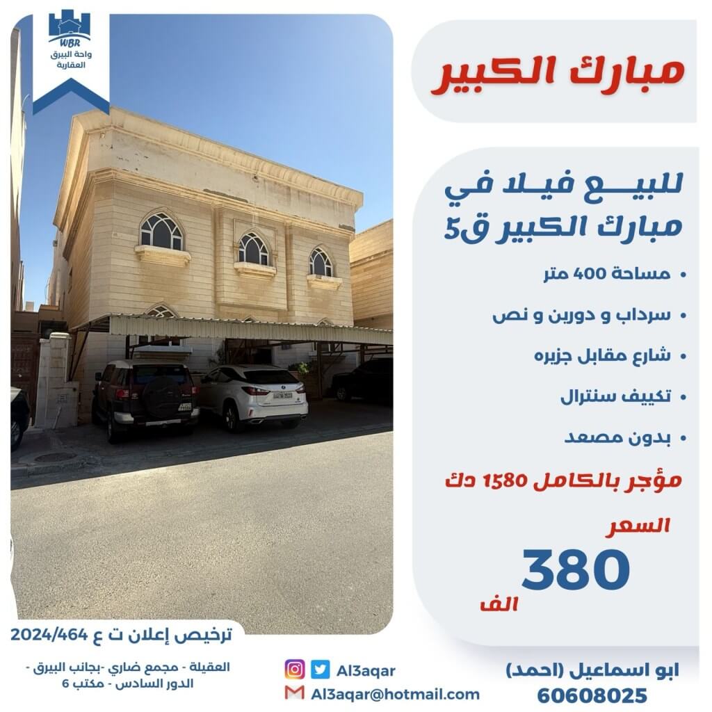 للبيع فيلا في مبارك الكبير ق 5 المساحة 400 م الموقع شارع مقابل جزيرة مدخل مخرج سهل قريب من الخدمات الوصف سرداب و دورين و نص مؤجر بالكامل 1580 دك تكييف سنترال بدون مصعد *السعر 380 الف*