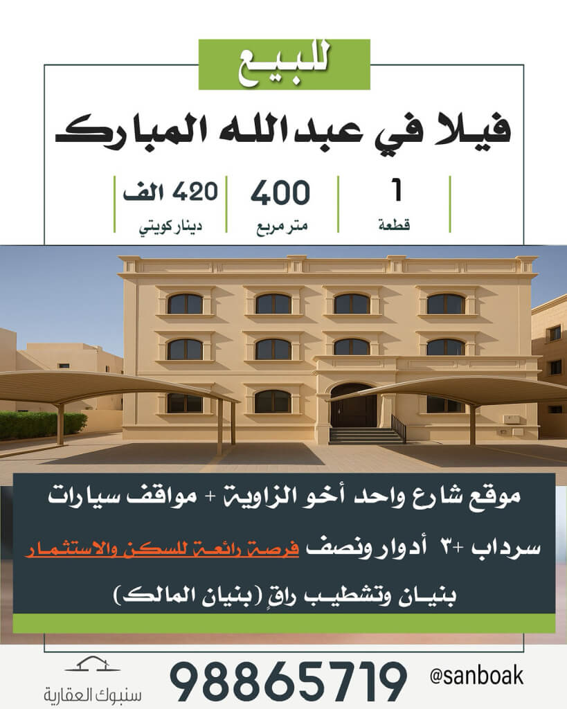 للبيع بيت مميز في عبدالله المبارك – فرصة رائعة للسكن والاستثمار! 📍 الموقع: قطعة 1 – شارع واحد (أخو الزاوية) مع مواقف سيارات 📐 المساحة: 400 م² 🏗️ البناء: سنة 2013 – بنيان وتشطيب راقٍ (بنيان المالك) البيت مكون من سرداب و 3 ادوار ونصف 📌 البيت مزوّد بالكامل بشترات، تكييف كولكس، تصميم أنيق وجاهز للسكن فورًا 📄 الوثيقة حرة – جاهزة للنقل 💰 السعر: 420,000 د.ك